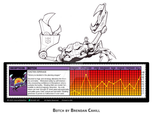 Very impressive! It's really interesting and cool to see you write in all of his bio and put it as one with your excellent drawing and colouring fan art of Botch as a whole MTMTE Profile page! I could easily see Botch in a G1 episode and I like your cool choice of idea changing his weapons gold instead of silver. Well done Navtej! No doubt Botch will really like this!