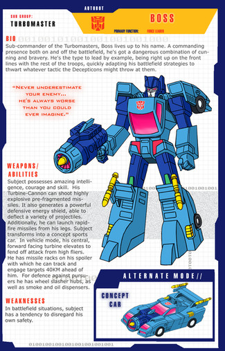 An original character created by myself. His pose is based on Bluestreak's toy box art.The amazing colours have been done by