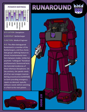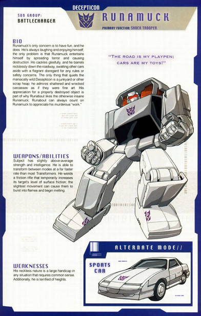 I came across the character sheet used for the Vehicons that featured in the Transformers Devastation game, and decided to gave them some quick colours and a character profile.Related content