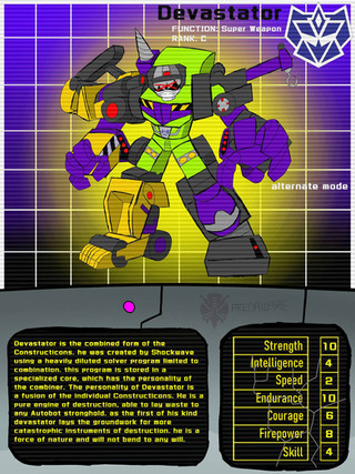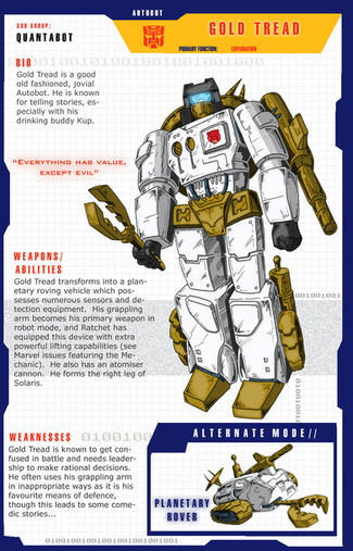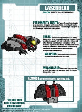 First and foremost, I must state that I did not draw this guy. I found a small character sheet of his toy here www.yusha.net/dagwon/mechanic2… which I enlarged, cleaned up, then applied a photomanipulation technique to make it look like line art and then I applied a digital inking technique, before giving him some quick and dirty colours.His character is based on an obscure character created by Simon Furman, whose only appearance is in Furman's novel Alignment. If your not familiar with alignment, its a story that takes place between G2 and Beast Wars, and is definitely worth a read.