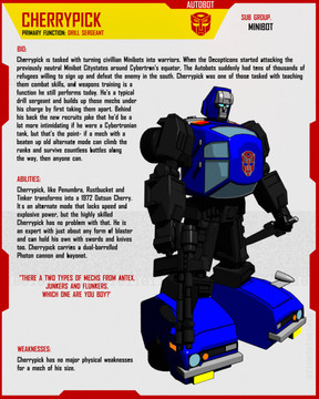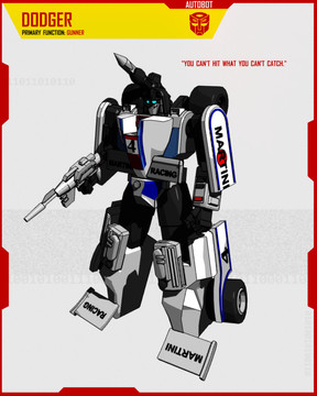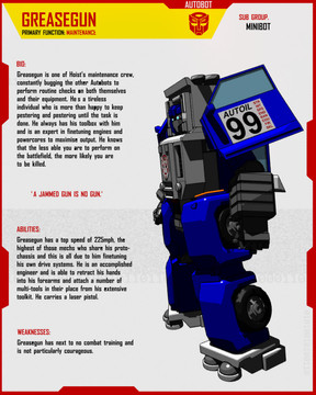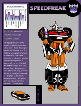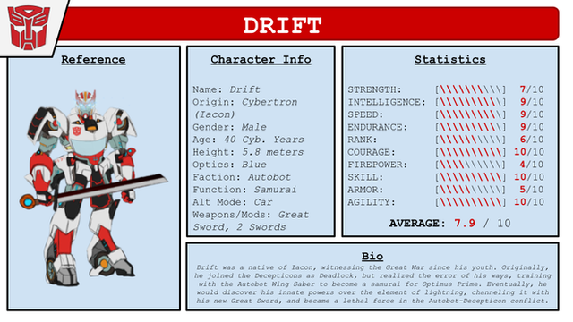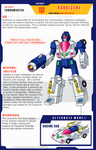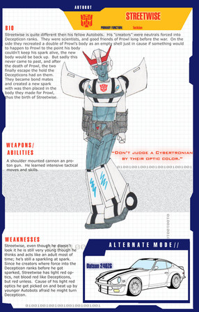 Never really liked how his face and front leg came out, but I couldn't resist colouring him and making one of my profile pages for him anyway. Especially, seeing as I'd already drawn his car mode, which seemed to come out pretty well considering I don't often draw cars.His bio is taken directly from his official Hasbro bio. The weapons, abilities and weaknesses have been summarised from his tech specs and IDW Universe back story.