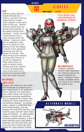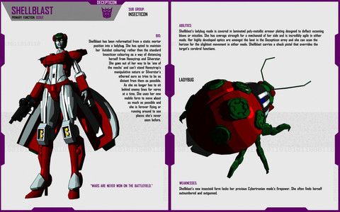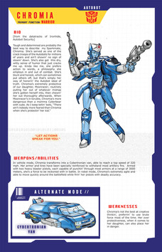 The full character profile is really interesting to read. I like the mention of her conflict with Starscream, gives more interesting history who this character dealt with. More importantly her status as a heir for being a queen! That is something I look forward to seeing in a comic.