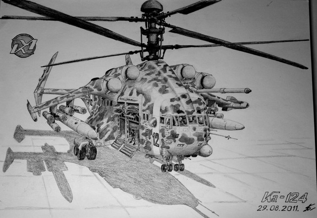 Kamov Ka-29 Helix naval assault/transport helicopter. I only realised how complex the shape to this beast machine really is, after I started drawing it. There's quite a few little mistakes on here too.Related content