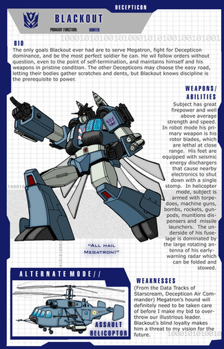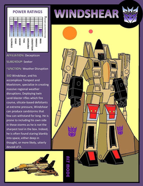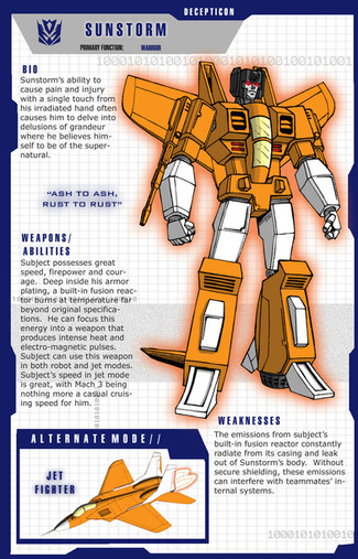 Nice work for a very obscure canon Seeker. Β In my head canon I call him Dunewing so not to confuse him with G1 Sandstorm. Β I also envision his personality as being kind of extreme. Β He becomes extremely aggressive towards any Decepticon he views as disloyal, occassionally even becoming violent when he gets the oppurtunity. Β Oblivious to the fact that he ends up sowing more dissent than he ends by doing so, he'll even criticize his officers for keeping them around. Β Which makes himself ironically disloyal. Β Needless to say, Starscream hates him and the feeling is mutual. The DJD's biggest (and only) fan within the Decepticon grunt force. Β
