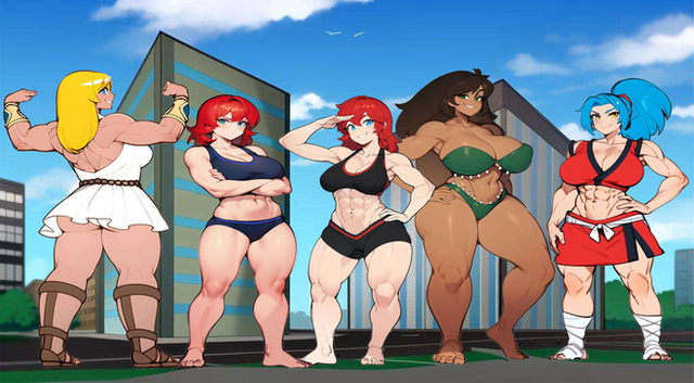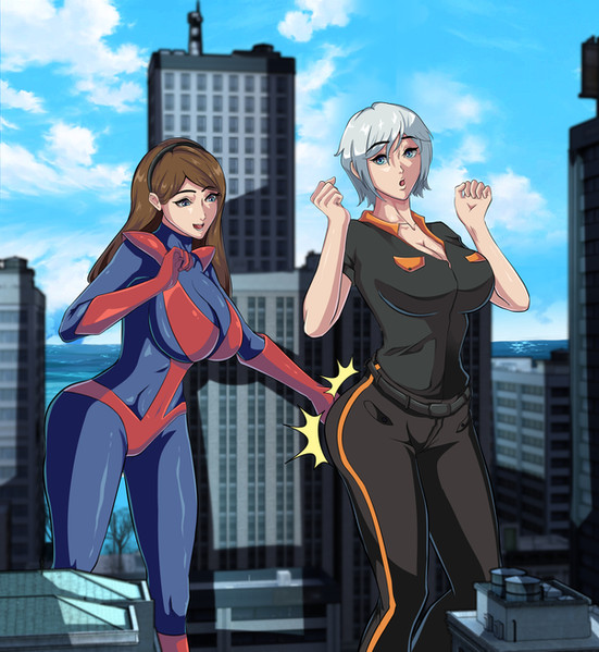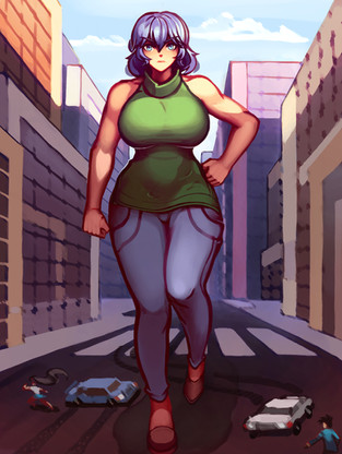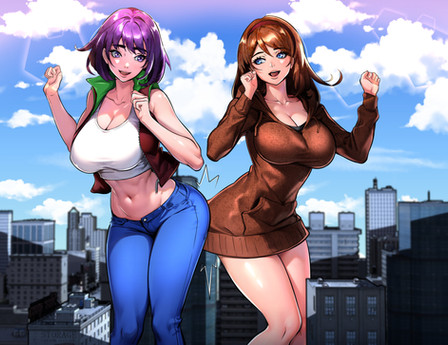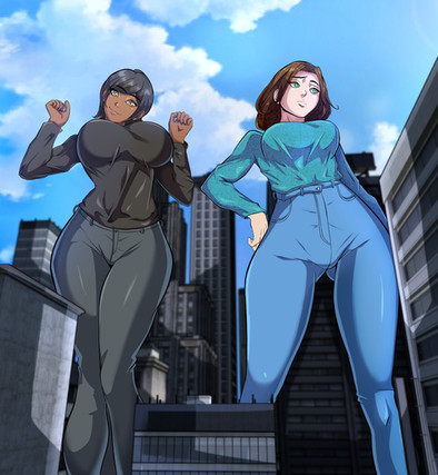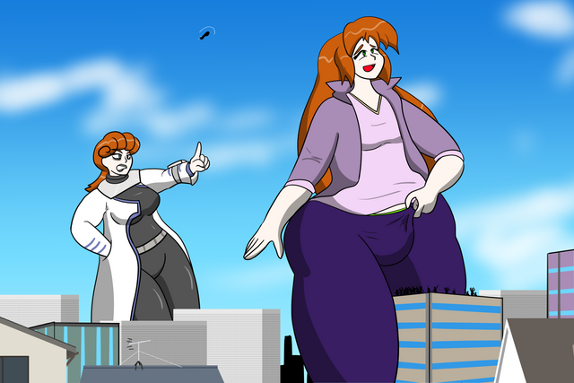 A commission done by .Kim and Roxanne are large and in charge! Well, actually, Kim is rather pleased with the sight of those smaller than her, and Roxanne couldn't care less. But still, they're large and that's what matters. This pic is loosely based off the stories Big Kim and The Amazing Colossal Roxanne .