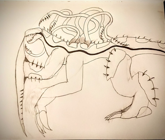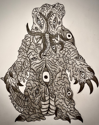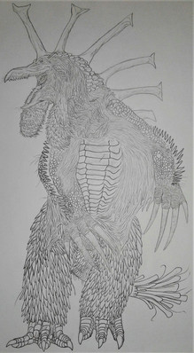 Another design idea that came to me when talking with AtolmAzel, who’s a huge fan of Hedorah. Wanted to combine the skull aspect of Deathla with some of the more Lovecraftian elements some artists have been giving Hedorah. Decided to throw in the excess brain matter of Down Tremendous as well, thought it worked with both the textures and silhouette. The little dots on the head are primitive light detecting eyes like some bivalves have. The structure underneath the body is sort of part egg sac part snail’s foot. Wanted to really embrace bits of both octopuses and amphibians.Hedorah owned by Toho.