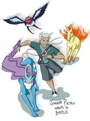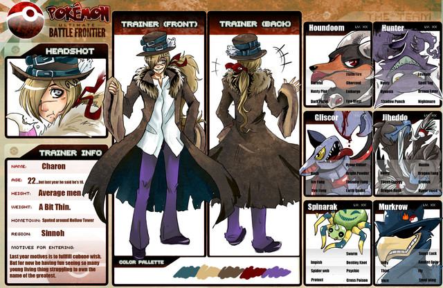 Yoichi is a professional dominator* who stumbled into Pokemon training as a sideline after one of his clients accidentally left behind a pokeball containing Chimecho. Underneath the leather and whip and four-plus-inch heels, he is actually a very nice, silly guy. His dominator alter ego is MISTRESS FLAMINGO. (You should see the ALTERNATE alternate outfit for that, hoho.)