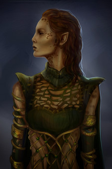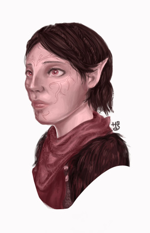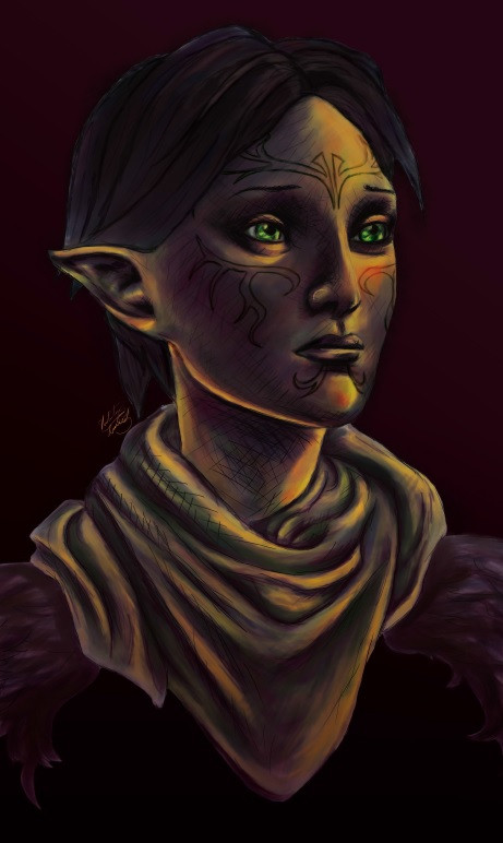 Very nice, I like especially how you have drawn her eyes as they look so lifelike! BTW, can't help this would be the exact expression on Merrill's face if Hawke found her frolicking in the forest!