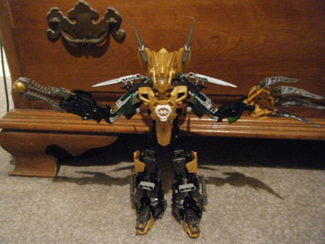 Conquest is my most recent Four Horsemen build. He's essentially a beefed up/modified redesign of Jet Rocka, but with an added "surprise"Ill post pictures of the added function later when i get better photos, but essentially, when he isnt wearing his armor or wielding his weapons, his weapons and armor can combine with eachother and become a full sized drone. Additionally he can transform while wearing it and become a fighter plane.