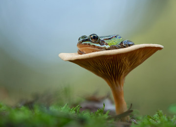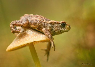 An American Toad sitting on top of a Bay Bolete mushroom.