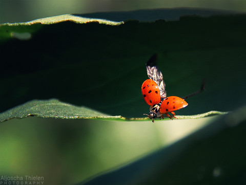 Oh my...! This is beautiful! I don't think I've ever seen so clear a picture of a ladybird with it's shell/carapace (seriously, what IS the word for the red thing with the dots on?) - never mind about to take flight!