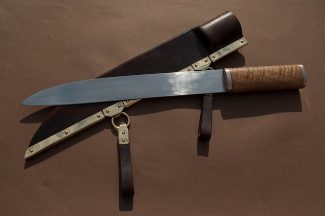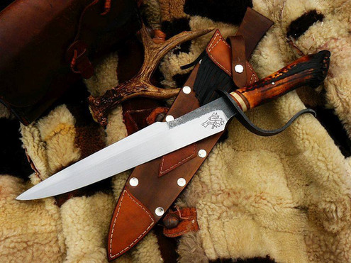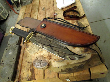 Bowie forged from 1080 with clay hardened blade. Hand stitched leather sheath and handle is brass and ebony.Related content