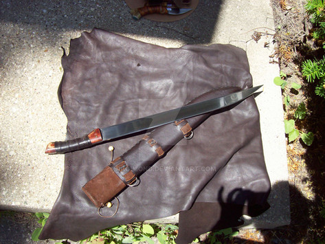 Falcata and side knife forged from 5160 steel with a sculpted brass hilt and hand stitched leather scabbard.Related content