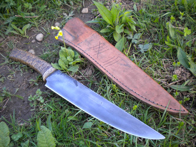It is 46.5 cm long, The blade is 31 cm long, 6.5 cm wide at its maximum and 6 mm thick. Forged of L6, 5160 and 1.2516 with around 200 layers, presenting my new experimental pattern