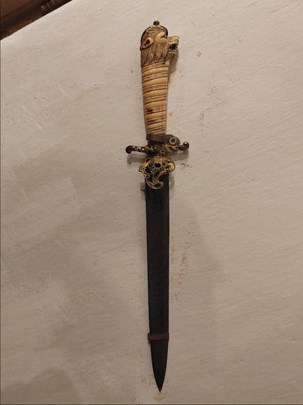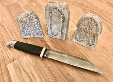 The handle is made of damascus steel, fossilized oak and bone.