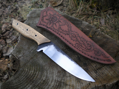 I forged this one from spring steel, its handle is oak with wrought iron pins and fittings.I wanted it to look as orcish as possible, coming directly from Grom Hellscreams forge