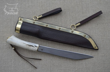 Its handle is roughly carved oak, with antler bolster and iron fittings. The iron gives balance to the large blade and also proves efficient when cracking nuts or anything else a proper viking would like to crack