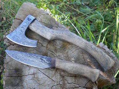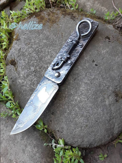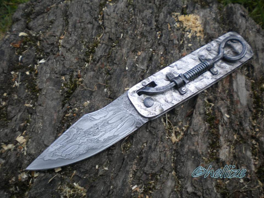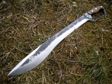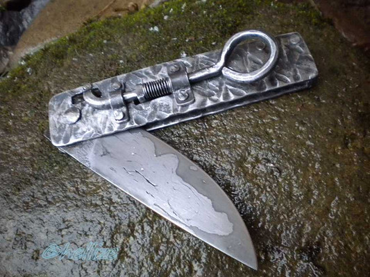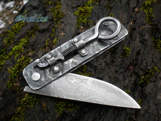 The blade is 9.8 cm long, 3.2 cm wide and 5 mm thick at its base. I forged it using 5160, 1.2516 and L6 and it has several hundred layers.