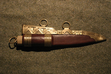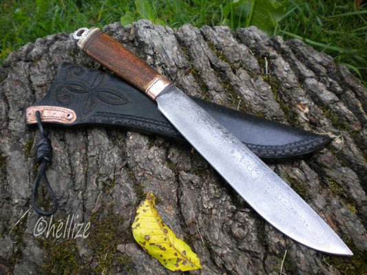 The Autumn knife is 30 cm long, with a 17 cm long, 4 cm wide and 5 mm thick blade. The handle is made of padouk, bronze and antler