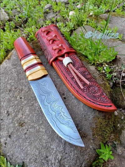 The sheath is hand sewed of thick cowhide.