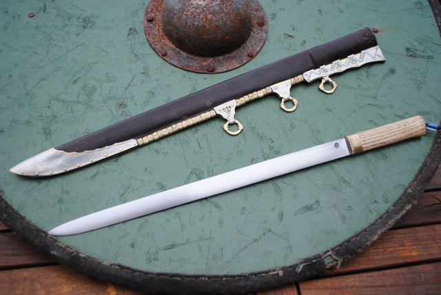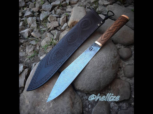 it's blade has been forged of 5160.the handle is made of fossilized oak and carved bronze.