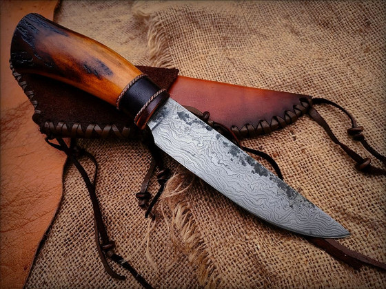 It is a damascus san mai with about 200 layers, which I hand forged from 5160, L6 and 1.2516. The handle is made of deer antler and leather disks.