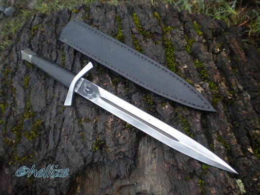 It is 46.5 cm / 18.5 inch long, with a 29 cm / 11.5 inch long blade, hand forged of 5160. The handle is made of stacked leather, treated with acrilic (it is waterproof) with forged crossguard and pommel.
