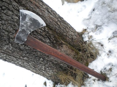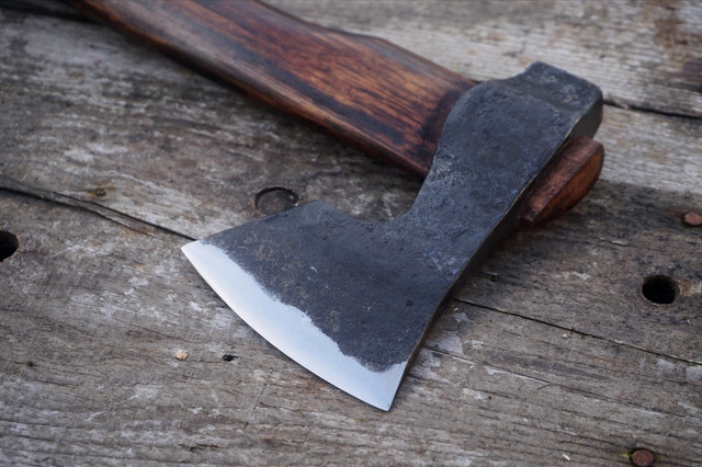 Has a 11 cm / 4.33 inch long edge. The head itself is 16.5 cm / 6.5 inch long and the shaft 40 cm / 15.75 inch.