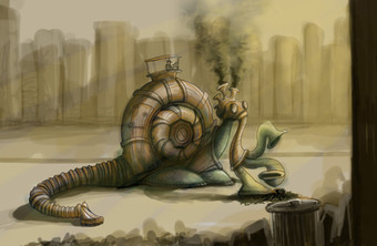 a painting i created of a robotic snail... its mission peramiters are to hunt down various leaves and consume as many as possable before a robo bird comes and eats it from inside its robo shell.... also robo robo o robe bo roRelated content