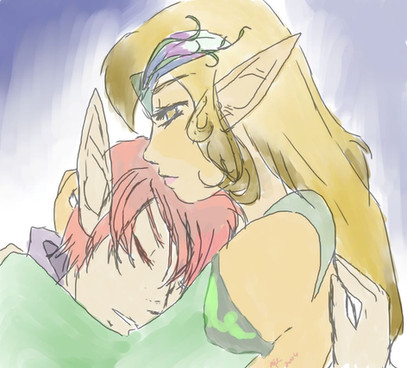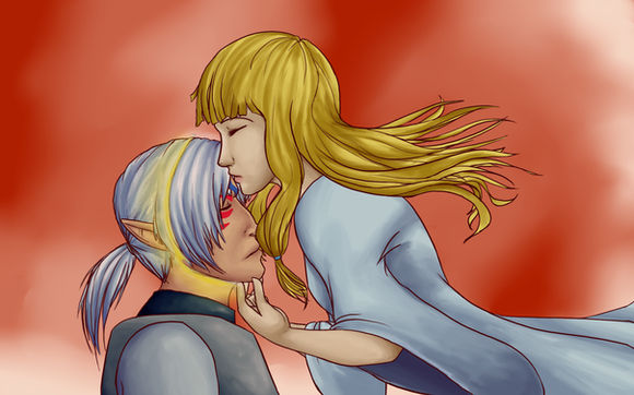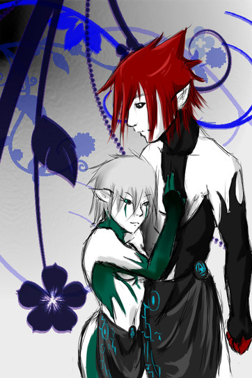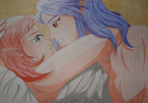 Oh wow, this came out beautifully! When I fullview it it just gets sort of odd and...pixelly, but nevertheless, the actual artwork is awesome! Their colors work really well together, especially against the dark background (that stained glass window? HOT) I really like the structure of their faces and arms and hands and RAWR, nice! I love Shiori's hair, and Opius's sparkley tear. So sweeeet.