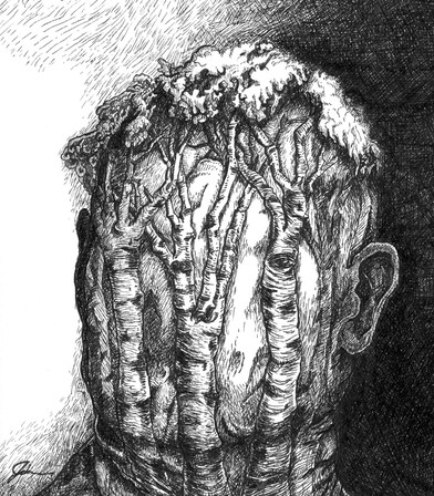 So what belongs... under the tree? Β Maybe there are more trees... The "messy" background forms one just over the boys head... and I see some trees near the trunk of the subject but in the distance... and rolling hills or plains... and it's raining. Β no bananas though... Beautiful piece.
