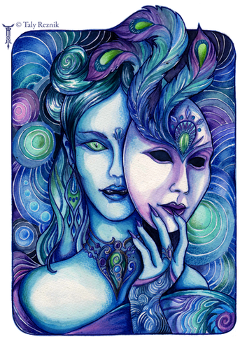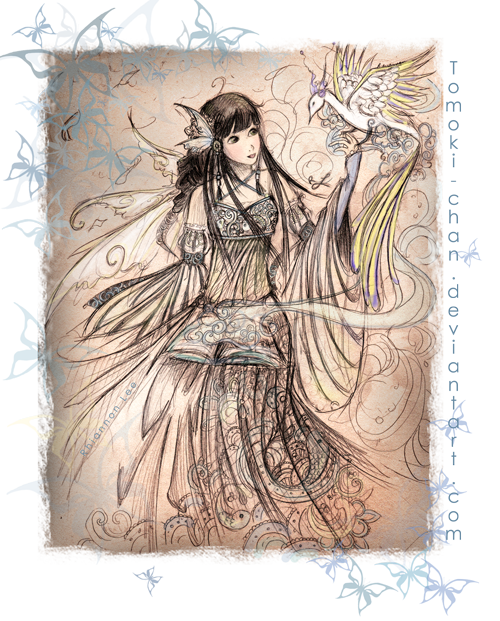 Love how the peacock looks like it's made out of water. Love her dress. Love her hair-decorations.