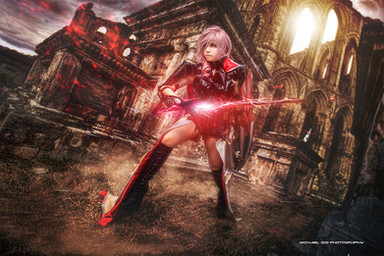 Firstly the compsotion of it all, the lighting itself is absolutely outstanding, the light in the background gives this piece a divine feel to it and the detail of the lighting is beautiful and the joy to the eye it brings is something that most cosplays don't do. The literal take on the light itself i.e the fact it encapsulates the Warrior of Light only adds to the significance of light in this piece that would put it's use in almost any other piece to shame. The brightest light comes from the from the slash of the Warrior and draws out the action of the piece superbly. It's amazing what a variety of shdes of light can do!