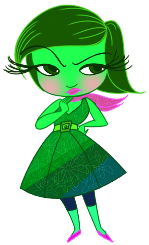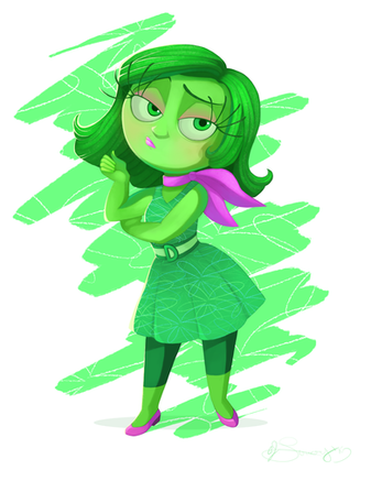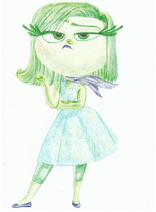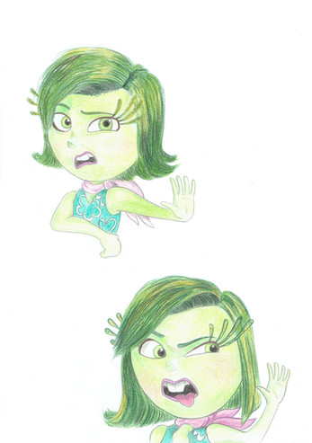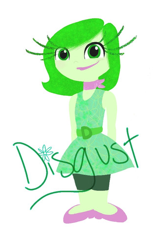 One of the reasons I loved Disgust was just because Β she was amazingly cute in her personality. But I also had one HECK of a time drawing her (both in a GOOD and BAD way). Mapping her out was fun but getting the right color scheme for her scarf and hair was really time consuming. Mainly because I was trying to make the scarf transparent around her neck and having her hair a bit visible behind it as well. But here is #3 out of 5. Stay tuned for Sadness. Hopefully before the end of the month.Disgust (c)