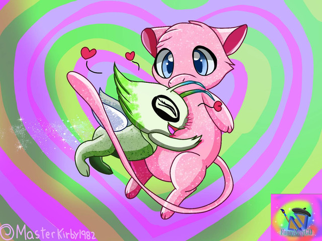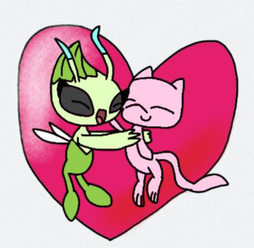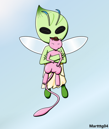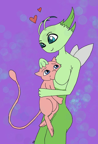A piece requested by MasterKirby1982 (sorry this is so late!!) I hope you like it.It features Mew and an anthro Celebi being affectionate. I like to imagine if this happened Mew would gently pat Celebi on the head. Head pats :3