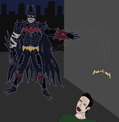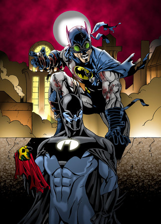 Crimson tears stained his cheeks as Bruce stood in his fathers study and readied himself to join his parents. A he raised the stake fate intervened once more to reveal his true purpose. A bat, that mighty and terrible beast of the night, shattered the windows of the study. Transfixed by the image of the bat Bruce saw what he must become.