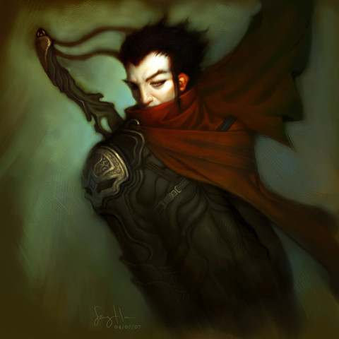 A necromancer with short swords, really intriguing! I think you've done a fabulous job with his costume design and the blue hands/forearms are pretty swank too *0*