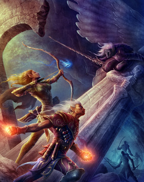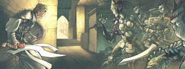 wow. having seen your old work, and this, i really like the changes that you made. in the other work, i always admired but never faved because to me it seemed like the man was being hindered by the woman, and his expression was too 'oh shit we're doomed'. In this, his cocky expression really changes the mood of the whole pic, while the grimness of the red-head's expression retains the dreadful anticipation of the attackers. Changing the perspective to be fromthe attackers and adding the falling masonry really made it a lot more dynamic and dangerous as well. There's a much greater visual depth in this as well, compared towhich the past version was a little flat. Also, the girl, here, doesn't seem as pathetic looking in the first version. she's scared, but no longer clinging to her man and impeding his use of his weapons.