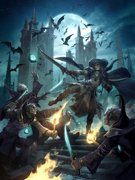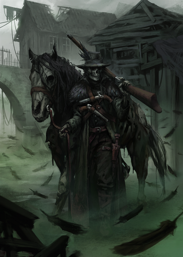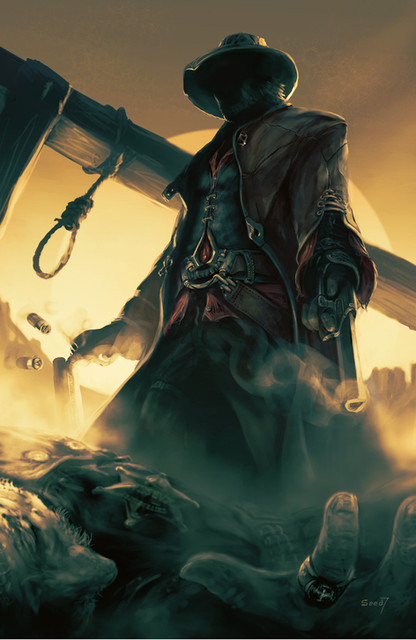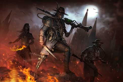 I really like this! The first thing that struck me was how the flash from the gun seems to illuminate the wound/blood. In my mind I liken it to shining light on the monster, and that brings a whole set of light vs. darkness themes to the piece. And then you have the hunter looking very rouge-ish, bringing depth to the white knight role. All in all, it's a very engaging piece. Oh, and the artwork is excellent too