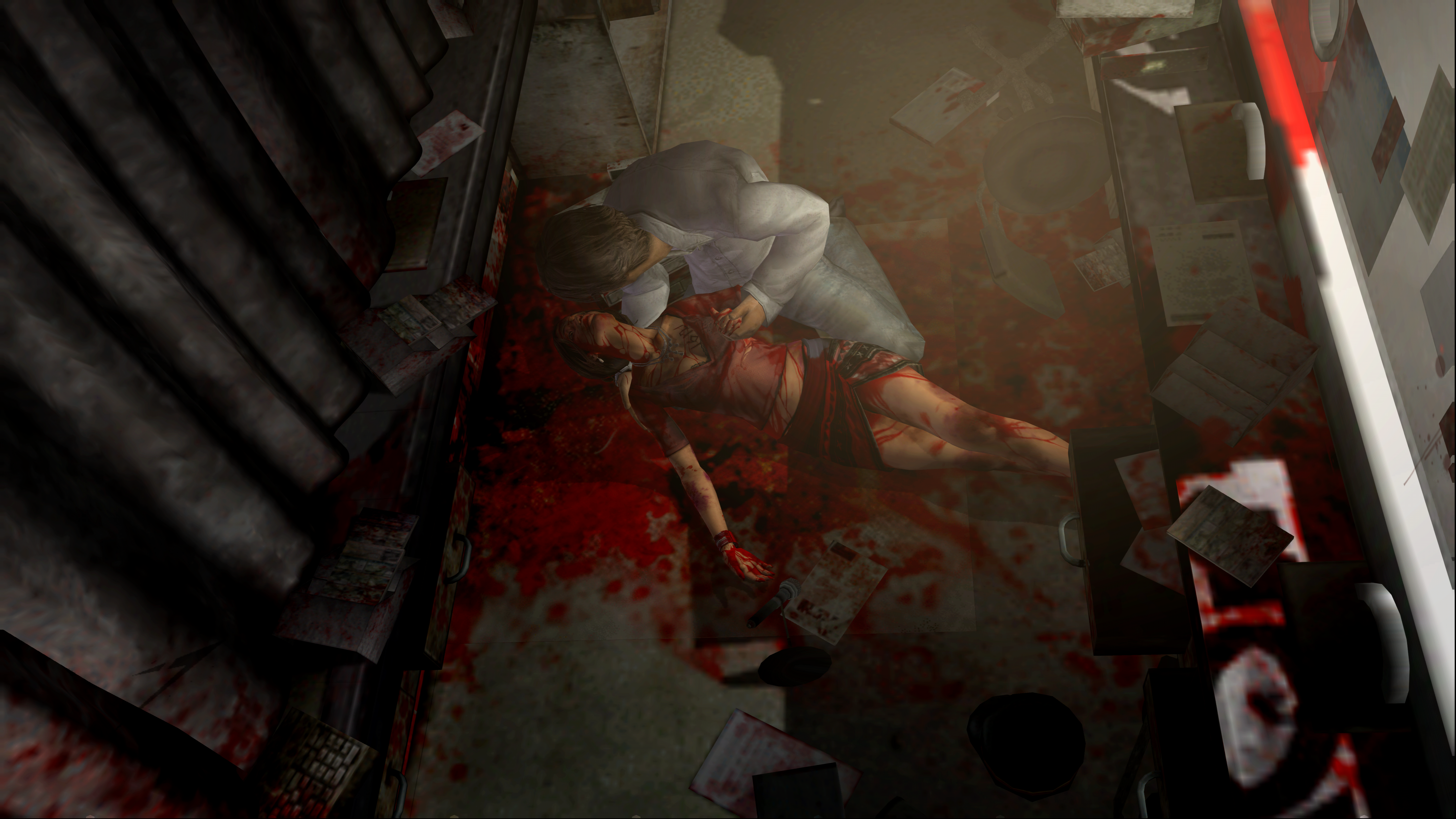 Hannibal Lector would love to have this corpse for dinner. The walls and blanket all splattered with blood are eerie and convincing. I think the nurse needs blood on her though. Otherwise, cool