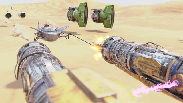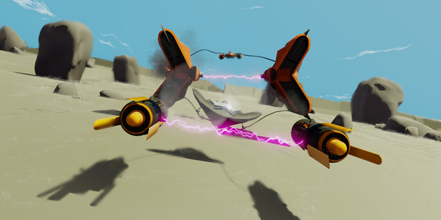 "Gage Antares and his podracer speed across the sands of Tatooine, during a revival of the Boonta Eve Classic."I felt like making some Star Wars fan art after finding a cool, highly detailed engine model.