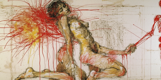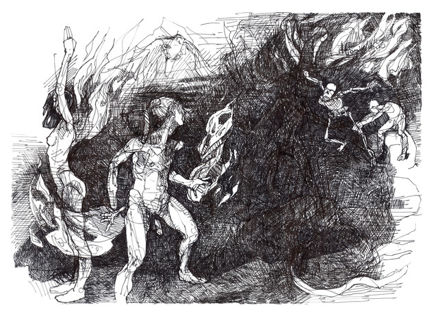 That aside, love the movement not only of the figures, but also of the lines. I like the movement of the skeleton too! He really looks like leaning in, although I think it would help if his right leg was opened to the side instead of closed towards the left leg. Anyway, great work!