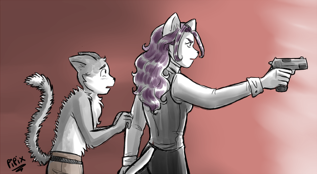 To end the conversation, the white cat took her colt from its holster and took the papier of the hands of her interlocutor. He strongly protested, considering that was a very bad idea, but she pointed the barrel of her weapon in his direction.