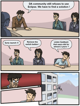 Haha, ne t'inquiète pas de casser l'ambiance, ça m'amuse même que quelqu'un se soit fait cette réflexion ! J'y pensais aussi en dessinant, en fait mon idée c'était surtout que l'on ne pouvait rien faire seul, surtout pour des problèmes comme le changement climatique, qui requiert la participation de tous, ou la destruction d'un immeuble vétuste, qui dépend du bon vouloir d'un décisionnaire. Mais c'est vrai qu'il a l'air un peu ridicule ce lanceur d'alerte, à pas bouger lui non plus