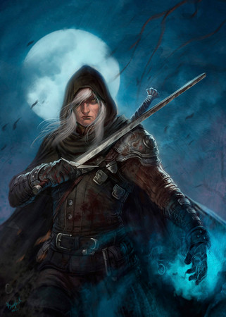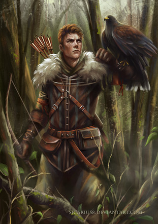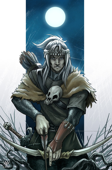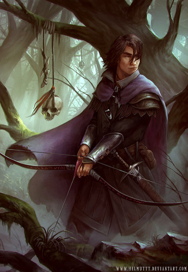 I love what is going on in this piece. Β He can either be the hunter or the hunted (or both). Β Good use of colors. Β I like the skulls hanging from the trees. Β Lots of power in this piece.