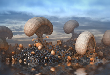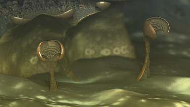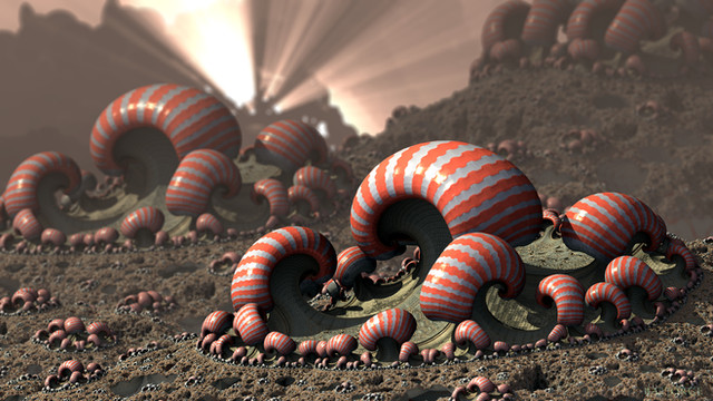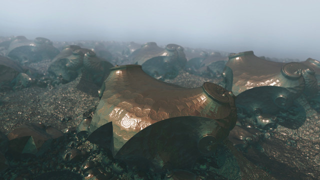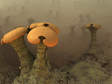 A moist, rocky, alien world covered in dense fog and still air. Creatures like mushrooms rest above the ground. I like it.