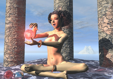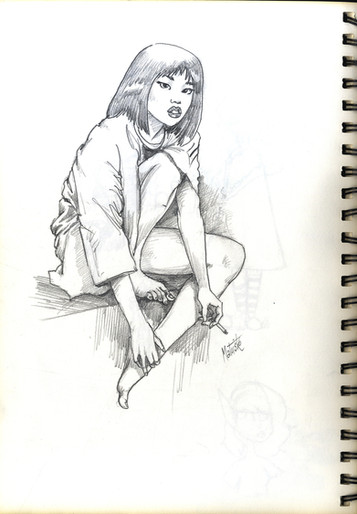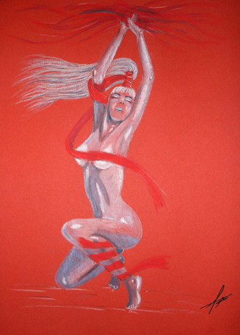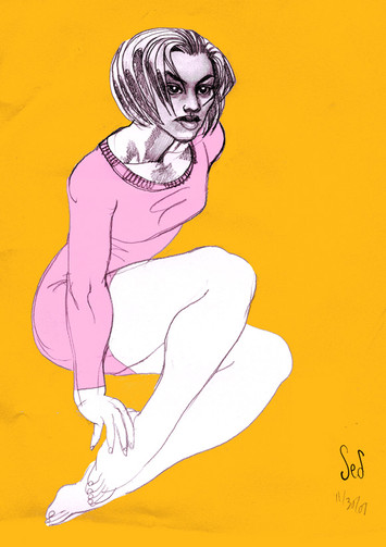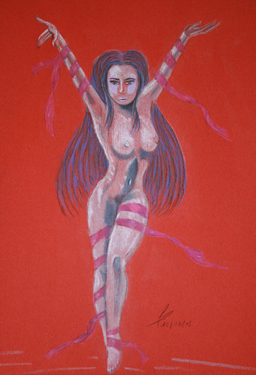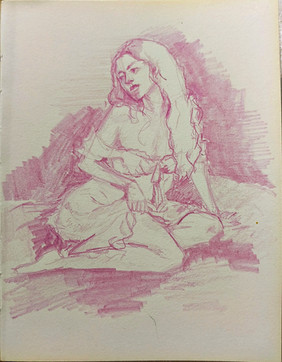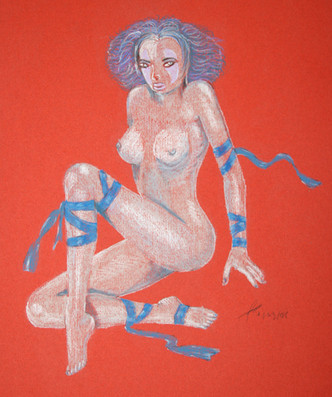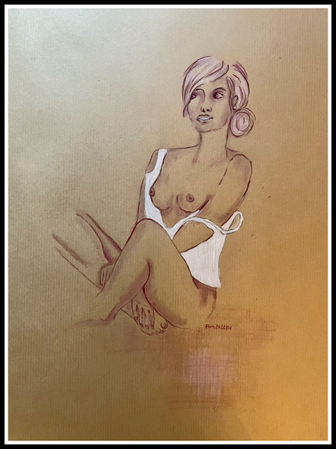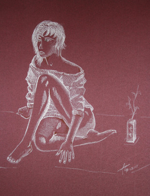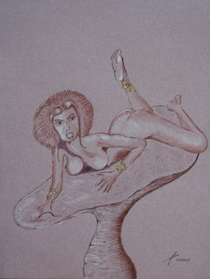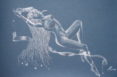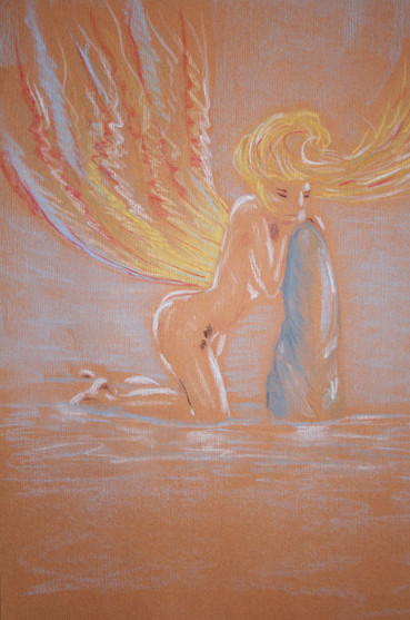The fairy Musa, in a quiet and dreamy pose. Maybe is she musing on a new piece of music ?(Withe pastel and sepia on coloured paper)