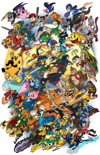 You can purchase a large print of this on my website's online store! www.mattherms.com/store/p25/Suβ¦Whew! So, this was a beast. I did a big fan art pic of Super Smash Bros. Brawl back in 2008 and it unfortunately didn't feature ALL the characters... And actually, this one doesn't either. But it does have 50 of the currently 52 KNOWN fighters. Can you guess who is missing right now?? I did leave some TINY empty spaces with the intention of adding the two I missed - as well as future DLC fighters. But we'll see.
