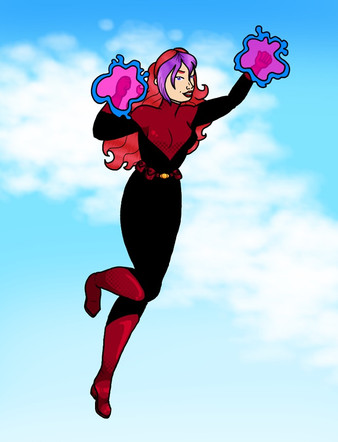 This is my own character, Rogue Atom.She has curly/wavy hair, which is something that is not supported by game mechanics, but that's the way I envision her.