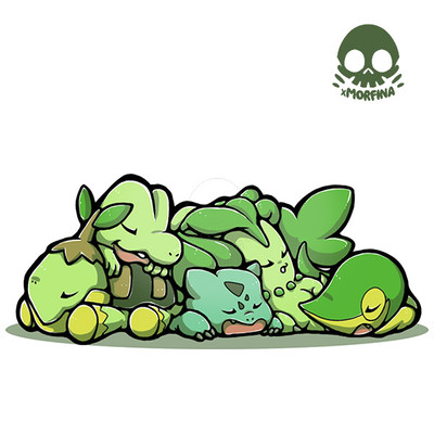 Finally finished something for once!! XDJust a pic of Bulbasaur, Chikorita, Treecko and Turtwig catching some z's. This is 1/9 in my project to render all of the starter evolutions together. It'll take me a while, but I want to do this because I have so much fun doing it ^_^ Might make some minor changes here and there, 'cause I'm picky like that, but for the most part it's finished and I love how it turned out! Hope the rest are as fun to draw as these guys were